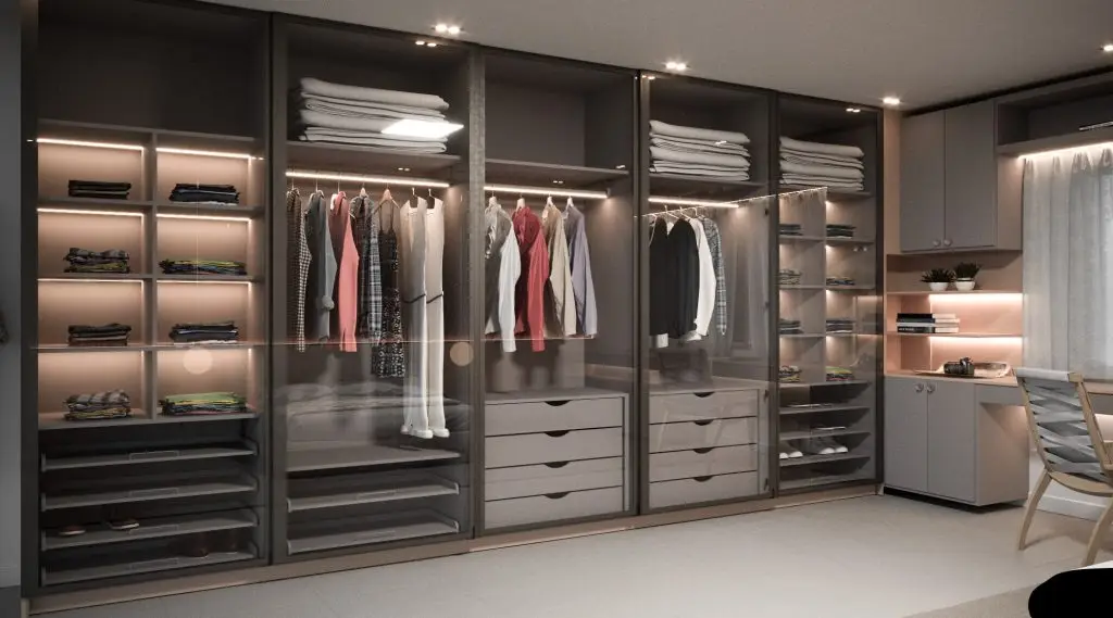 Com divisórias inteligentes, iluminação embutida e acabamento sofisticado, o closet planejado oferece organização, conforto e luxo em um só espaço.